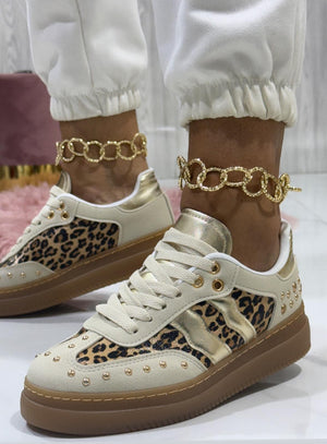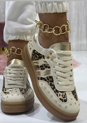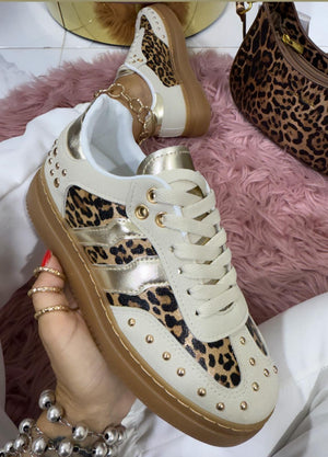 Queste sneaker leopardate sono perfette per chi ama uno stile elegante e selvaggio! Realizzate in ecopelle e tessuto, sono impreziosite da borchie dorate che conferiscono un tocco di lusso al tuo look. Con la loro comoda suola, saranno le tue compagne ideali per ogni occasione.