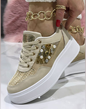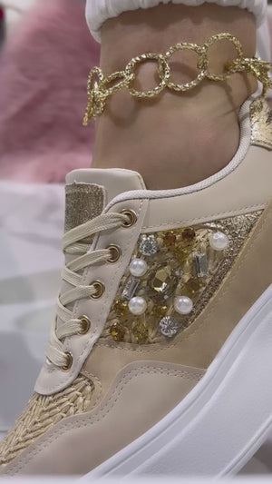 Le Sneakers Hollywood Beige presentano una tomaia in tessuto misto ecopelle e una suola in gomma bianca alta. Le pietre laterali colorate conferiscono un tocco di eleganza e stile. Comode e alla moda, queste sneakers sono perfette per ogni occasione.