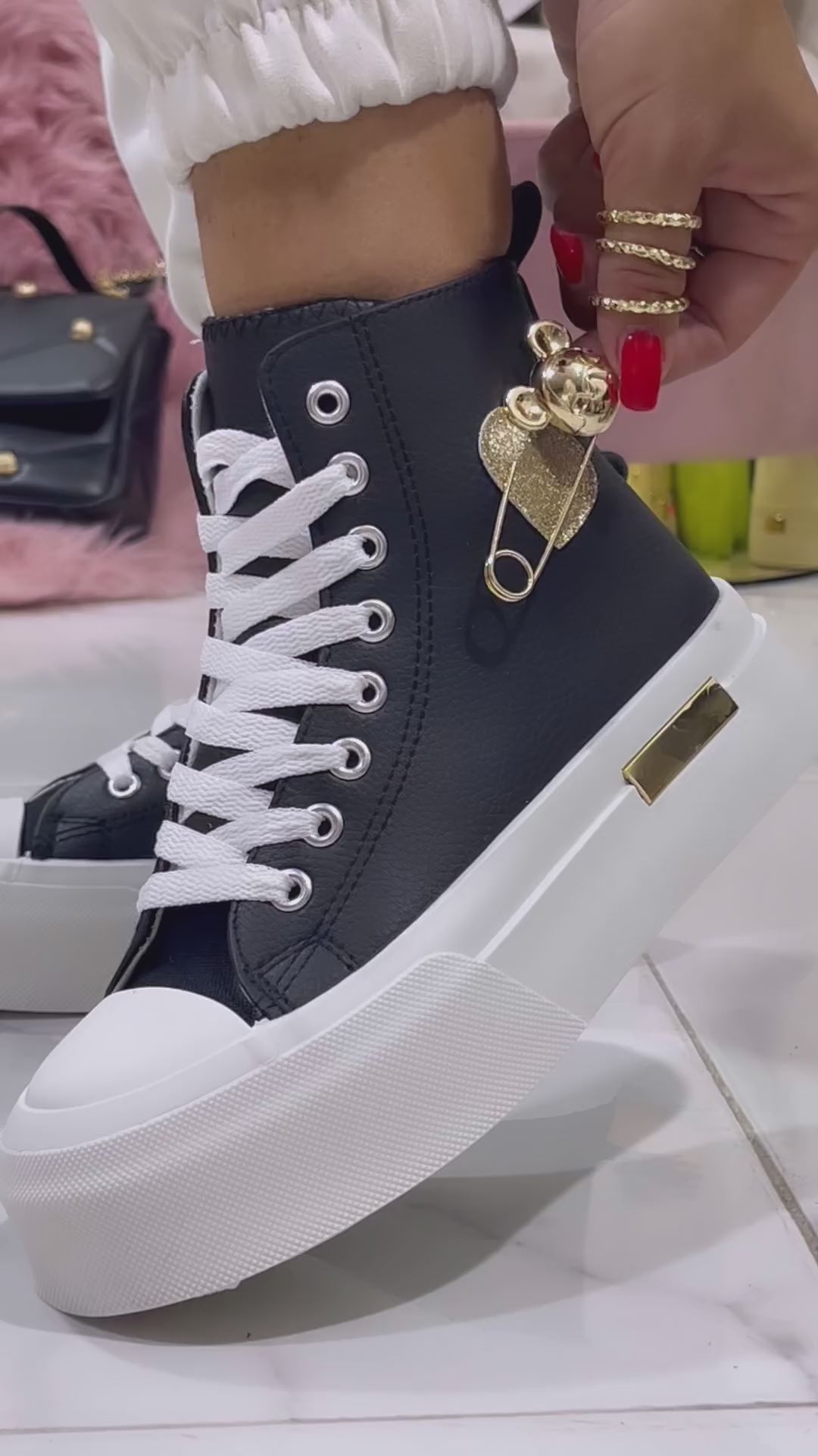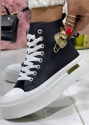 Le nuove Sneakers Passione Nere sono realizzate in tessuto ecopelle con elegante spilla oro e suola in gomma da 4,5 cm. Garantiscono un mix perfetto di stile e comfort per ogni occasione. Ordina le tue sneakers ora e aggiungi un tocco di glamour ai tuoi outfit di tutti i giorni!